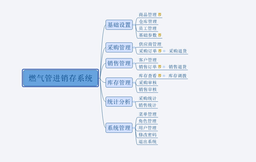 首先,对系统进行需求分析,首先需要了解的就是什么是进销存系统,进销存系统也称为供应链管理系统,最基本的内容就是采购、库存、销售、退货管理。进销存系统是对企业生产经营中采购、入库、销售进行跟踪管理,从采购单开始,到商品入库,商品销售出库,每一步都跟踪记录。有效解决企业的分销管理等业务问题。那么燃气管进销存系统有何不同呢,其实进销存系统已经具备了一般商品的进销存功能,燃气管就是一种商品。以此为出发点,开始着手设计系统功能模块。