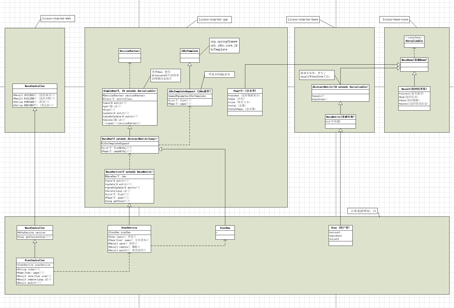 然后在 com.lyyzoo.data.domain 包下,Page 封装了分页相关的属性,如当前页数据、页码、每页大小、总页数等。com.lyyzoo.data.util 包下,Sqls 封装了操作 SQL 语句的工具,比如根据传入的查询语句,返回查询总数的 SQL 语句。在 com.lyyzoo.data.jdbc 包下,JdbcTemplateSupport 封装了比较复杂的查询,比如根据传入的参数、分页条件等,自动查询数据、总数并封装到 Page 里返回。com.lyyzoo.data.dao 包下,SimpleDao 封装了基于 Hibernate SessionFactory 的简单的增删改查操作,如 save(),get()等方法。dao 包下,BaseDao 继承 SimpleDao,并代理了 JdbcTemplateSupport,使得 BaseDao 具有 SimpleDao 和 JdbcTemplateSupport 的功能,BaseDao 则作为其它 dao 的一个父类存在。最后,在 com.lyyzoo.service 包下,BaseService 代理了 BaseDao,进行了进一步的封装,BaseService 是其它 service 类的父类,其它 service 就可以直接调用 save、get、page 等内置方法。
