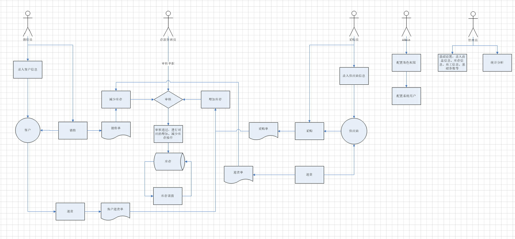 系统的一个整体流程,从初次使用开始,系统设置一个超级管理员(admin),拥有系统的所有权限。admin 登录系统,设置角色(系统管理员,采购员,销售员,库存管理员),分配对应的权限。然后进入用户管理,录入系统用户。一般管理员登录系统,录入基础数据;采购员需要录入供应商,采购单,退货单;销售员则需录入销售单,退货单。库存管理员就需要在库存管理中进行采购审核和销售审核,采购审核通过则商品入库,增加库存;销售审核通过则商品出库,减少库存。管理员还可以查看每月的采购统计和销售统计。