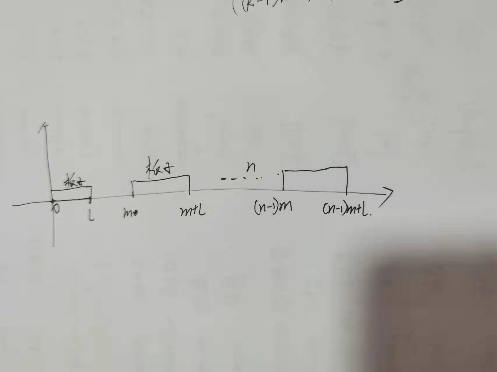 In one one-dimensional world there are nn platforms. Platform with index kk (platforms are numbered from 1) is a segment with coordinates [(k-1)m,(k-1)m+l][(k−1)m,(k−1)m+l] , and l The first input line contains 4 integer numbers nn , dd , mm , ll ( 1<=n,d,m,l<=10^{6},l Output the coordinates of the point, where the grosshopper will fall down. Don't forget that if Bob finds himself on the platform edge, he doesn't fall down. 题目描述:在一坐标轴上给出n块板子,每个板子所占的空间为[(k-1)m,(k-1)m+l](l Translated by 稀神探女 输入 #1复制 输出 #1复制 输入 #2复制 输出 #2复制 其实这题,关键是要看懂题目。 简单来说就是,从原点起跳,每次跳的距离为d,跳到没有板子的地方就停止了。有n块板子,每块板子一样长,长度为l,板子和板子之间有间隙,题目中的k其实是板子的编号,从1到n。那么板子与板子之间的距离其实就是(m-l)。 大概就是图画的那样 题目看懂了那么题目就很好写了输入格式