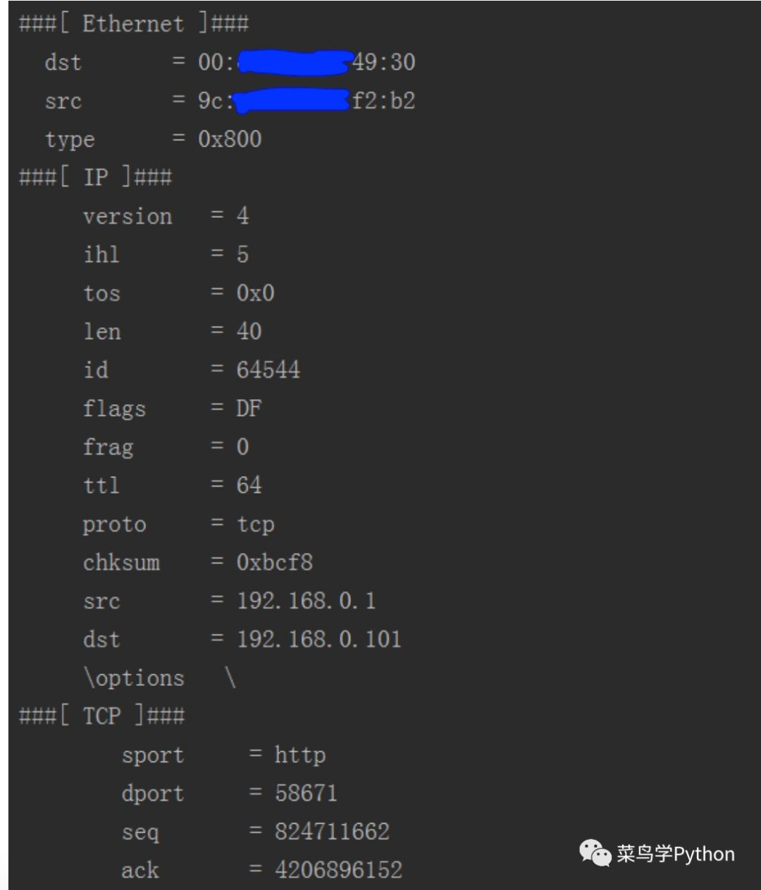 packets=scapy.sniff(iface=iface_name,prn=pktTCP) 一行代码就搞定了,其中iface_name是网卡的名称,在网卡的属性中可以找到,pktTCP是返回的数据包,它长下图这样: