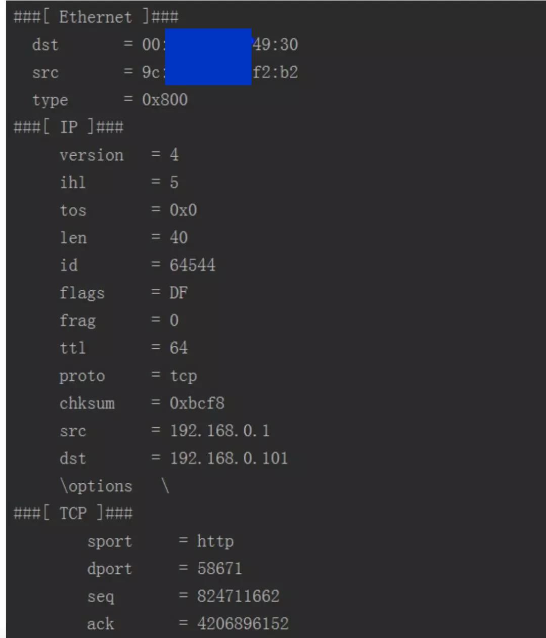 一行代码就搞定了,其中iface_name是网卡的名称,在网卡的属性中可以找到,pktTCP是返回的数据包,它长下图这样: