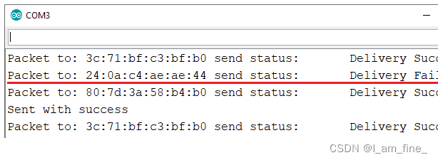 void OnDataSent(const uint8_t *mac_addr, esp_now_send_status_t status) {char macStr[18];Serial.print("Packet to: ");/**串口提示向哪块板子发送**/snprintf(macStr, sizeof(macStr), "%02x:%02x:%02x:%02x:%02x:%02x",mac_addr[0], mac_addr[1], mac_addr[2], mac_addr[3], mac_addr[4], mac_addr[5]);/** 以下几句将在串口输出接收端的板子是否接收到了消息,方便调试 **/Serial.print(macStr);Serial.print(" send status:\t");Serial.println(status == ESP_NOW_SEND_SUCCESS ? "Delivery Success" : "Delivery Fail");