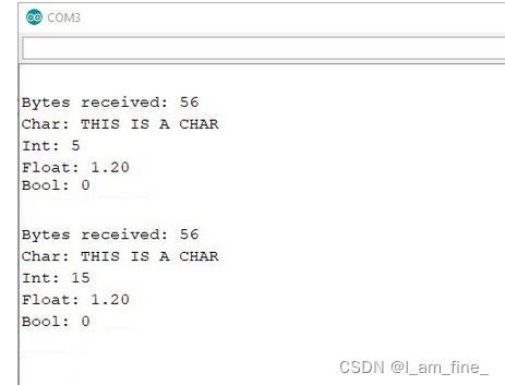 void OnDataRecv(const uint8_t * mac, const uint8_t *incomingData, int len) {memcpy(&myData, incomingData, sizeof(myData));Serial.print("Bytes received: ");Serial.println(len);Serial.print("Char: ");Serial.println(myData.a);Serial.print("Int: ");Serial.println(myData.b);Serial.print("Float: ");Serial.println(myData.c);Serial.print("Bool: ");Serial.println(myData.d);Serial.println();