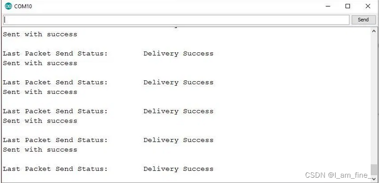 }void loop() {// 设置发送的数据myData.id = 1; //注意这里的id,每块发送的板子不能重复myData.x = random(0,50);myData.y = random(0,50);// 向指定MAC地址发送数据esp_err_t result = esp_now_send(broadcastAddress, (uint8_t *) &myData, sizeof(myData));if (result == ESP_OK) {Serial.println("Sent with success");}else {Serial.println("Error sending the data");}delay(10000);