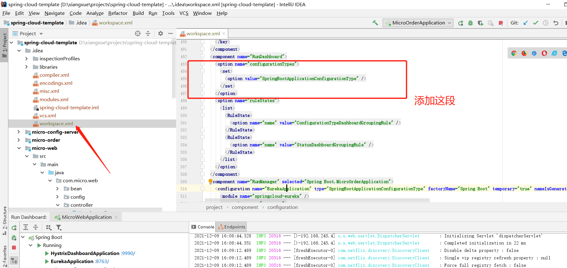 1.打开workspace.xml文件,搜索RunDashboard标签,添加下图标签