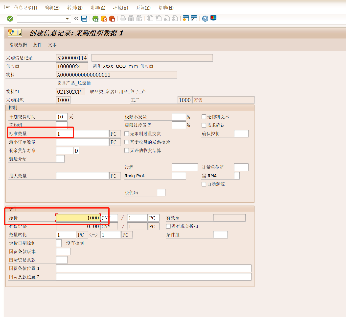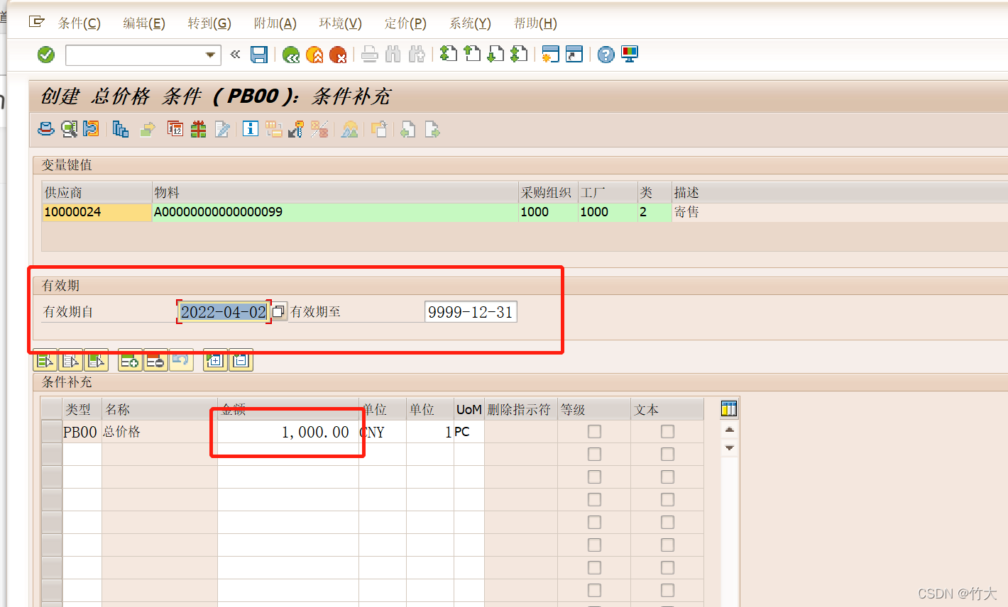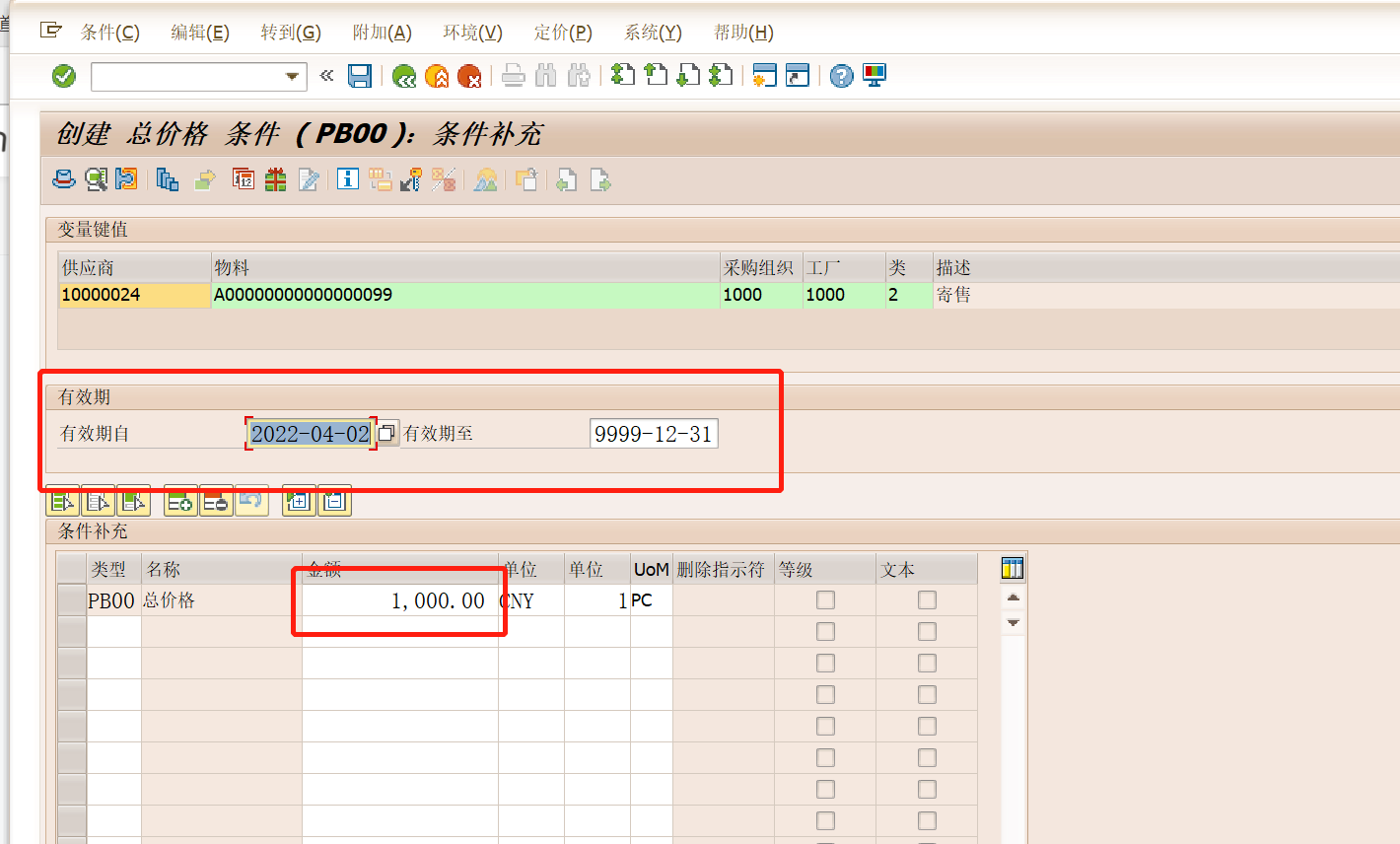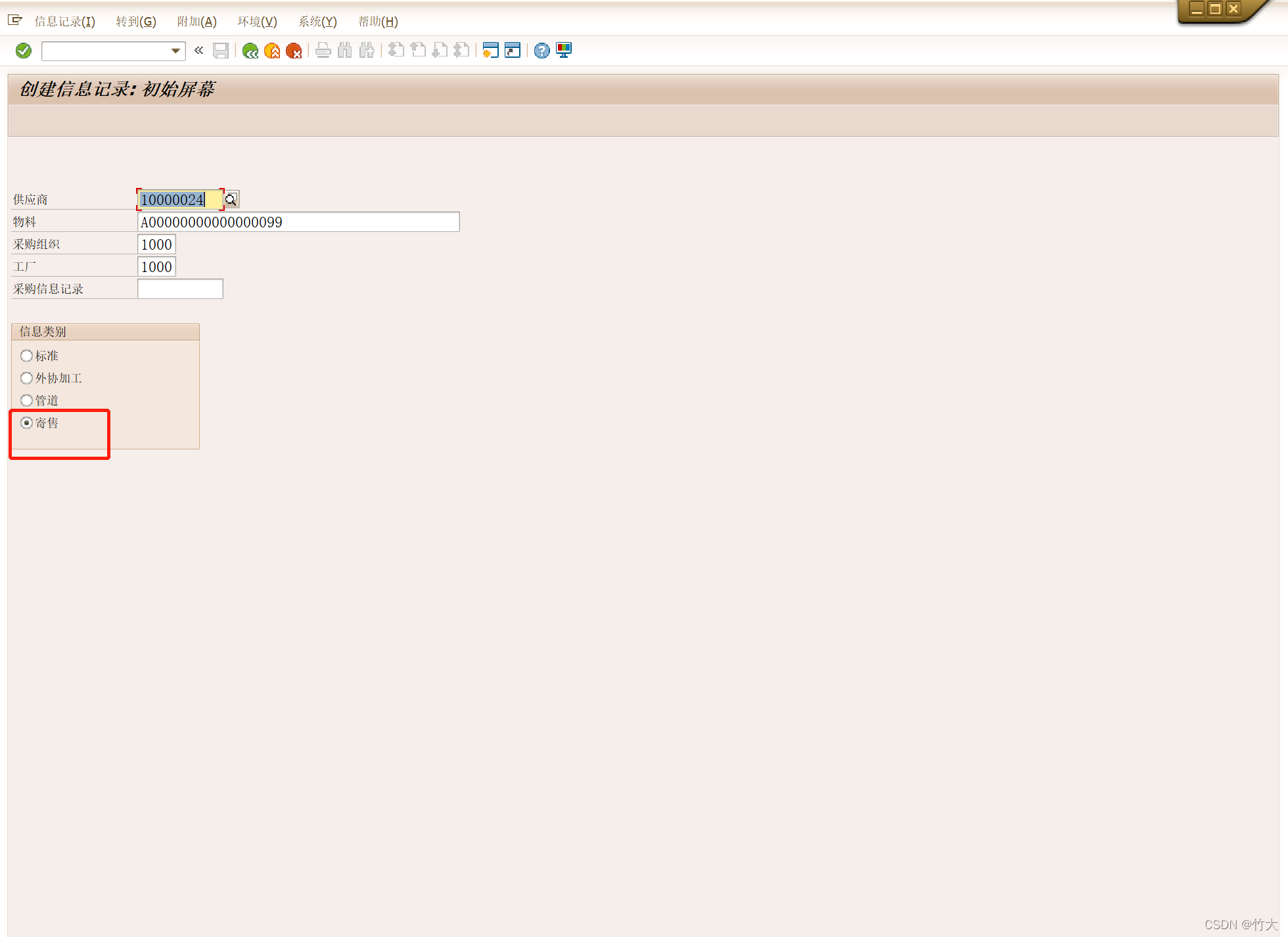上面这个价格是必须要维护的,因为供应商寄售库存,入库的时候是不结算的,只有消耗的时候结算,因此消耗的时候和供应商结算的价格,指的是采购信息记录中维护的价格。