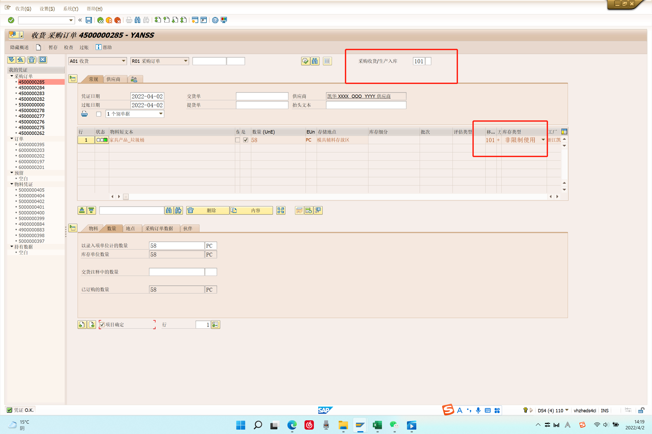 供应商 号 的那个地方,要与你的供应商库位 收货的供应商相匹配,否则会报错。