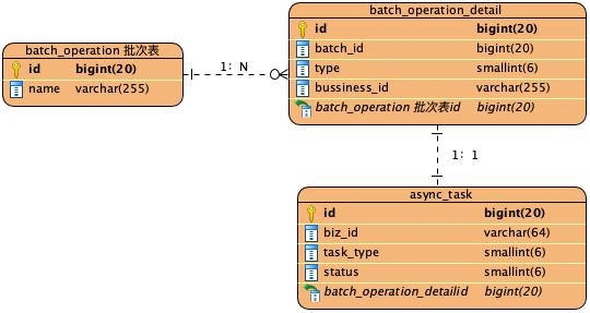 一共3张表,2张业务表:批量操作记录表batch_operation,id为主键,还有个批次名称;一个批量操作明细表batch_operation_detail,id为主键,batch_id为批次号,对应batch_operation的主键id,还有一个类型type,加一个业务字段bussiness_id。