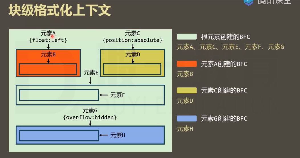 这个区域 由某个 HTML 元素创建,以下元素会在其内部创建 BFC区域