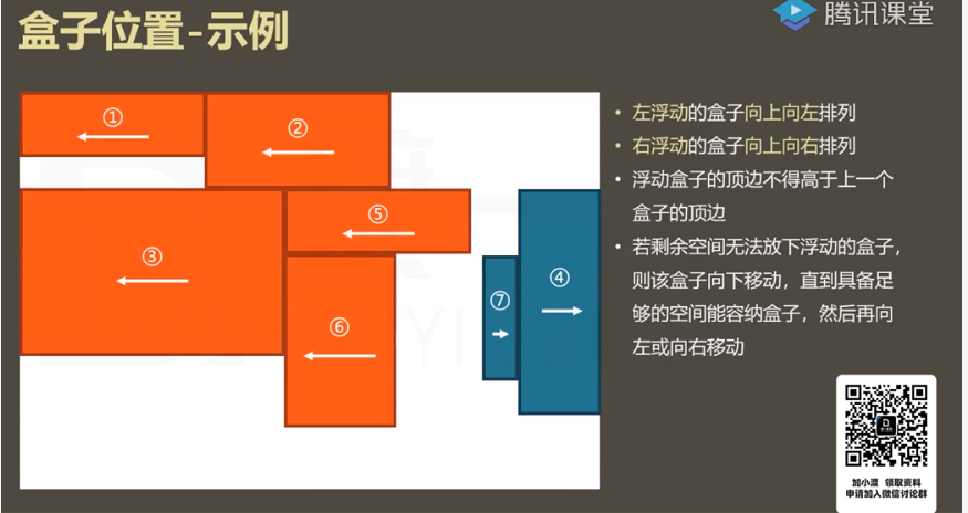 * 若剩余空间无法放下浮动盒子,该盒子会下移动, 直到具备足够空间容纳盒子, 然后再向左向右移动