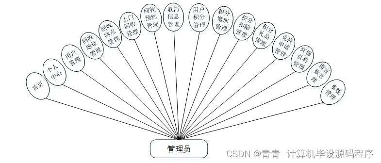 系统中的核心用户是系统管理员,管理员登录后,通过管理员菜单来管理后台系统。主要功能有:首页、个人中心、用户管理、回收地址管理、回收网点管理、上门回收管理、回收预约管理、取消信息管理、用户积分管理、积分增加管理、积分扣除管理、积分礼品管理、兑换申请管理、环保百科管理、留言板管理、系统管理等功能。服务端用例如图3-7所示。