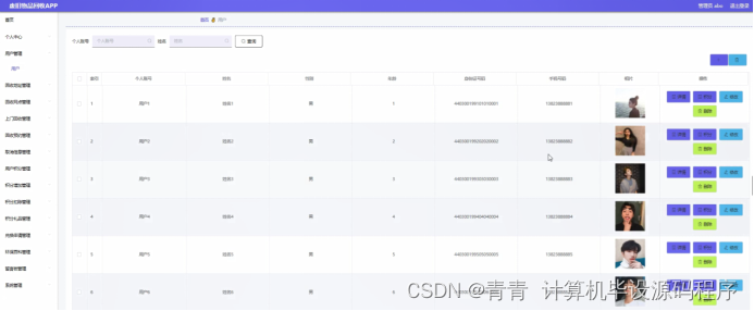 用户管理,在用户管理页面可以对索引、个人中心、姓名、性别、年龄、身份证号码、手机号码、相片等内容进行详情、积分、修改或删除等操作,如图5-10所示。