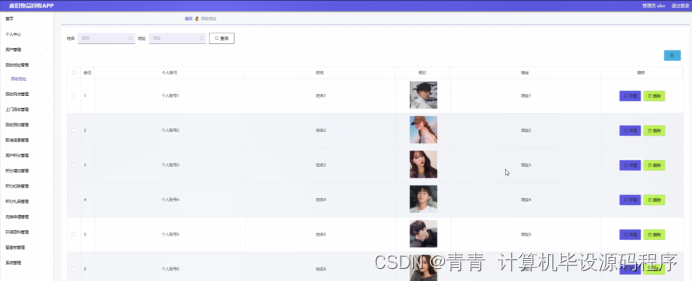 回收地址管理,在回收地址管理页面可以对索引、个人账号、姓名、相片、地址等内容进行详情或删除等操作,如图5-11所示。