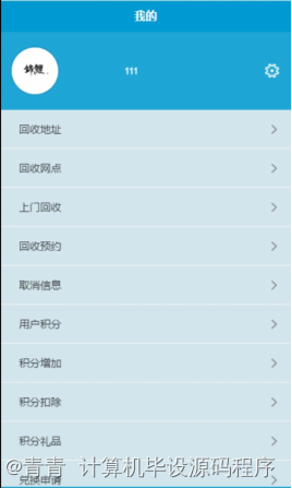 我的,在我的页面可以对回收地址、回收网点、上门回收、回收预约、取消信息、用户积分、积分增加、积分扣除、积分礼品、兑换申请、我的收藏管理、留言板等详细信息进行操作,如图5-6所示。