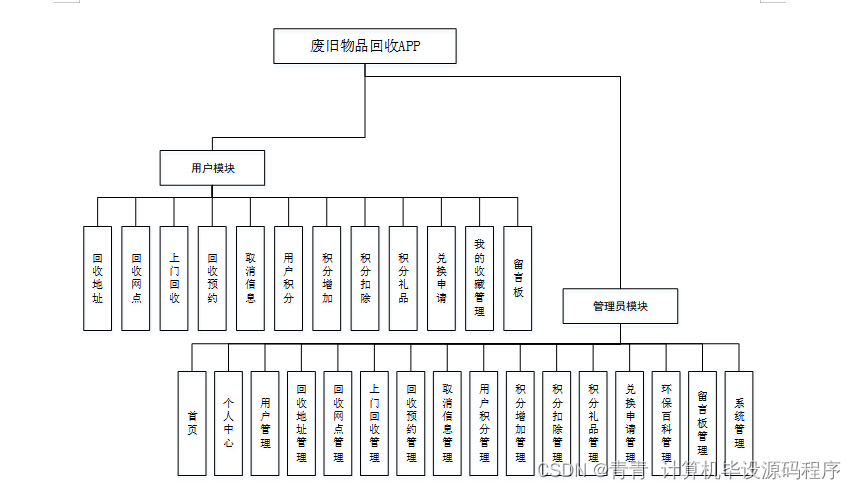 系统架构图属于系统设计阶段,系统架构图只是这个阶段一个产物,系统的总体架构决定了整个系统的模式,是系统的基础。废旧物品回收APP的整体结构设计如图4-2所示。