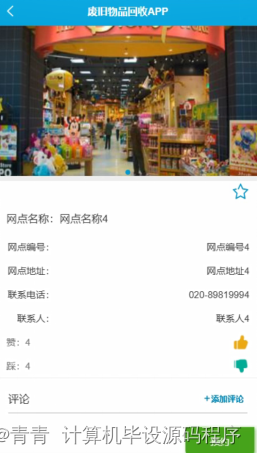 回收网点,在回收网点页面可以查看网点名称、网点图片、网点编号、网点地址、联系电话、联系人等信息,可进行预约、评论或收藏,如图5-4所示。