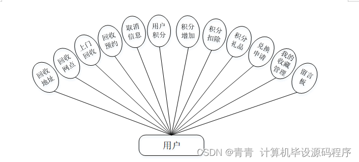 用户实现功能包括回收地址、回收网点、上门回收、回收预约、取消信息、用户积分、积分增加、积分扣除、积分礼品、兑换申请、我的收藏管理、留言板等功能。用户用例如图3-8所示。