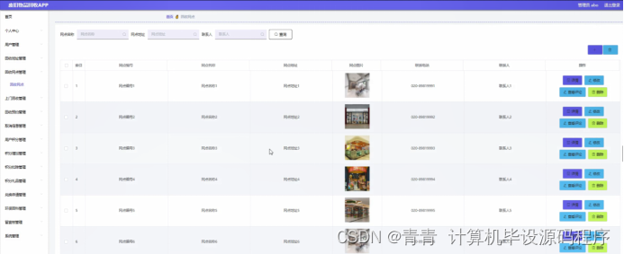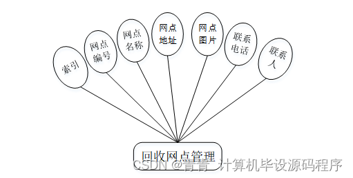 回收网点管理,在回收网点管理页面可以对索引、网点编号、网点名称、网点地址、网点图片、联系电话、联系人等内容进行详情、修改、查看评论或删除等操作,如图5-12所示。