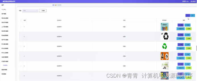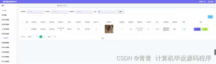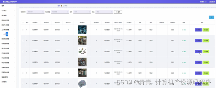 上门回收管理,在上门回收管理页面可以对索引、信息编号、物品名称、物品类型、物品大小、物品图片、物品数量、物品重量、预约上门时间、个人账号、姓名、地址、审核回复、审核状态、审核等内容进行详情或删除等操作,如图5-13所示。