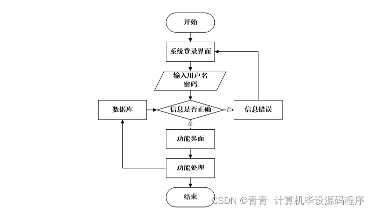用户打开并进入系统后,会先显示登录界面,输入正确的用户名和密码,系统自动检测信息,若信息无误,则用户会进入系统功能界面,进行操作,否则会提示错误无法登录,操作流程如图3-3所示。
