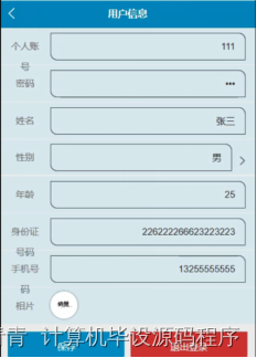 用户信息,在用户信息页面通过填写个人账号、密码、姓名、性别、年龄、身份证号码、手机号码、相片等详细信息进行保存操作,如图5-7所示。