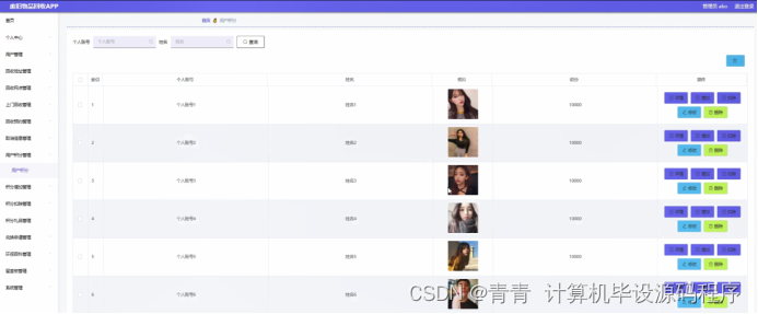 用户积分管理,在用户积分管理页面可以对索引、个人账号、姓名、相片、积分等内容进行详情、增加、扣除、修改或删除等操作,如图5-15所示。