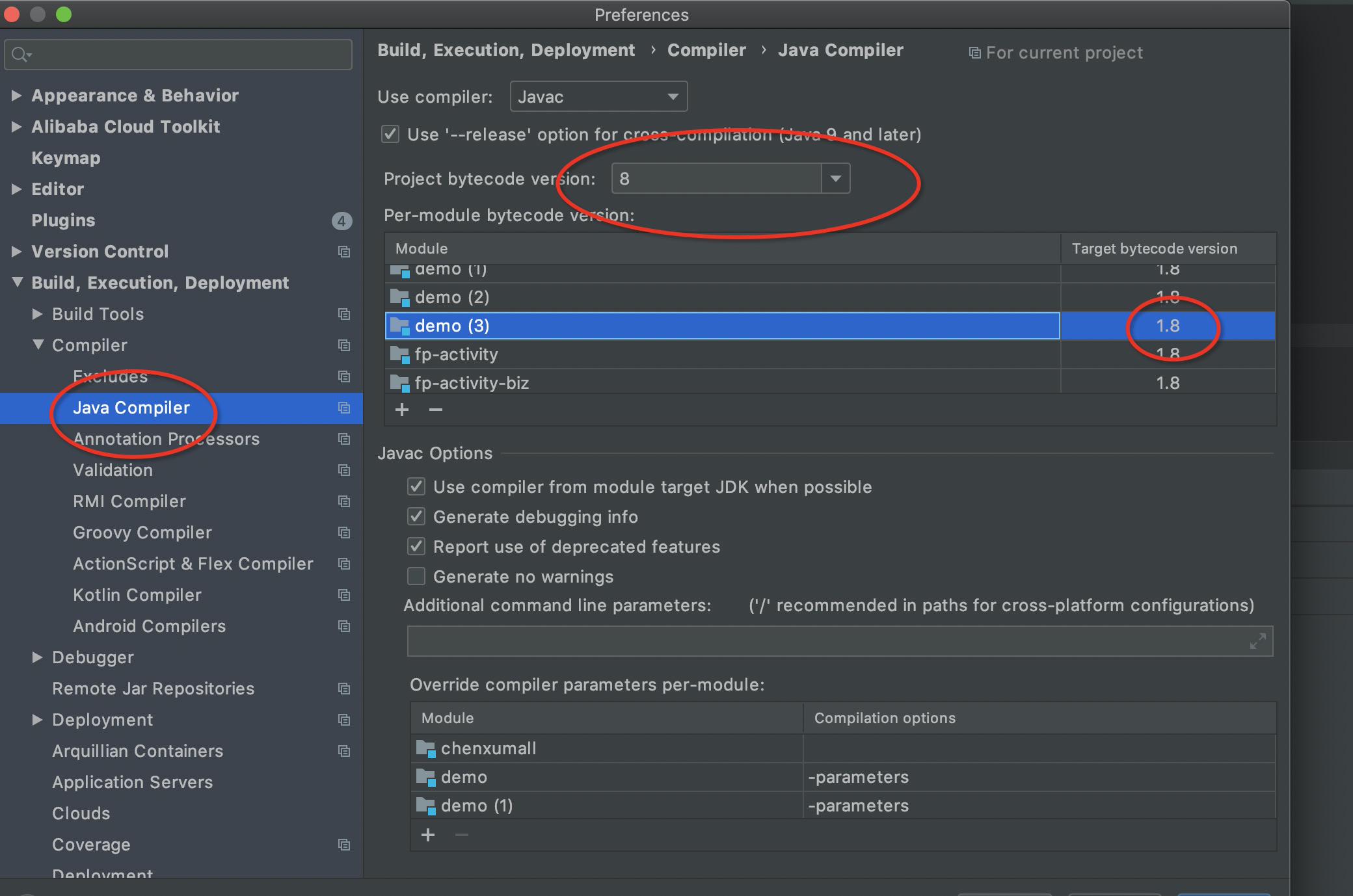 4.IntelliJ Idea-->Preferences--->java compiler 修改 project bytecode version 和 Target bytecode vesion 加上以上修改的地方保持一致就可以了