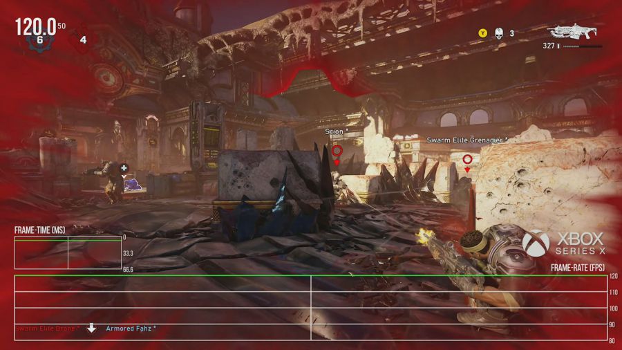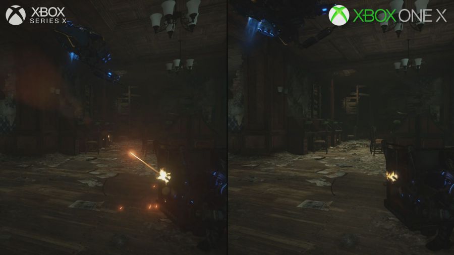 多人模式帧数提升至 120 帧,DF 用人机模式最大化 CPU 负载,结果帧数基本全程稳定在 120 帧,画面在虚幻引擎的 TAA 抗锯齿以及更高的平均分辨率下表现依旧出色。DF 使用 LG CX 电视进行体验后的结论是,120 帧对于本世代多人游戏会带来很好的体验提升。分屏模式仍然是 30 帧没有变。