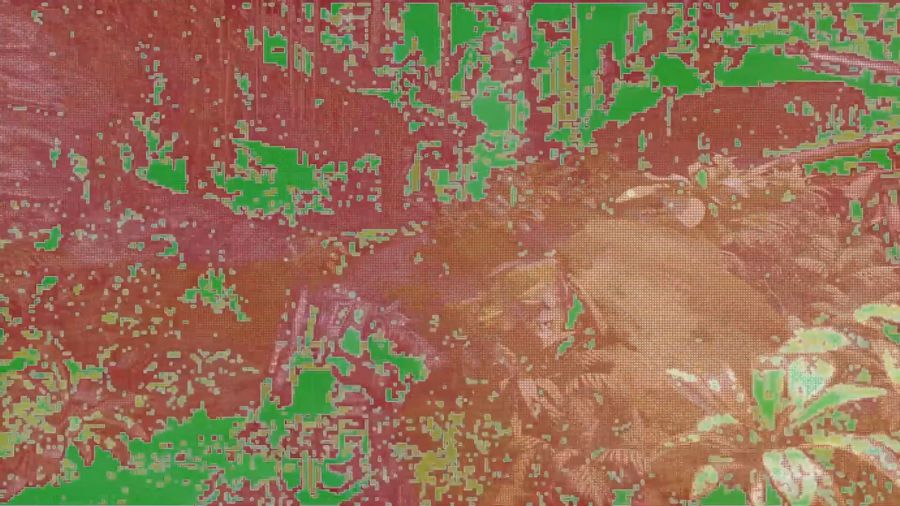 另一个技术是此前《战争机器 战术小队》中开始实验的可变速率着色(Variable Rate Shading),即 VRS。VRS 能在合适的画面情况下降低渲染精度,换取更高的帧数和整体分辨率,比如运动的画面。就以下图的情况来说,画面各个颜色的部分渲染精度是不一样的。