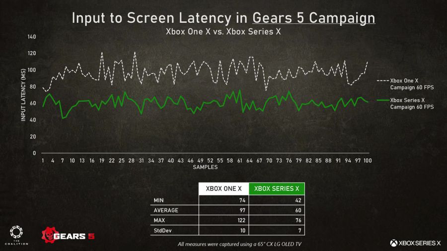 对操作体验的提升也不容忽视。次世代版运用了动态延迟输入(Dynamic Latency Input)技术,显著降低了输入延迟。带给玩家更好的操作体验,120 帧模式下输入延迟被进一步降低。DF 做了点简单测试,提升的效果跟微软公布的数据差不多。DF 认为降低输入延迟是一项对游戏体验改进很重要的一环工作,玩家能够非常直观地感受到低延迟的效果,比如每一次抬手射击的顺畅感。DF 希望该技术能在次世代游戏中被重视起来。