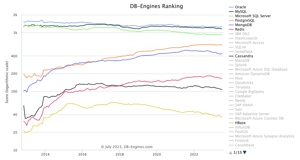随后出现了大量基于该模型的数据库系统,包括 Oracle、MySQL、SQL Server、PostgreSQL 等,这些产品至今依然在 DB-Engines 排行榜上占据了绝对优势。
