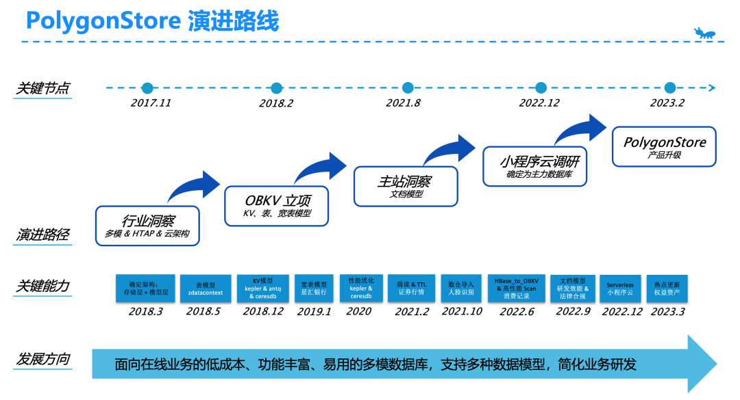 2022 年 12 月我们通过对小程序云的业务调研,开始建设 Serverless 能力,并随后被确定为小程序上的主力数据库产品。2023 年 2 月依托于小程序云场景建设的 Serverless 能力,我们进行了产品升级,并命名为 PolygonStore。