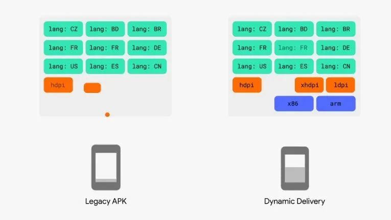 目前,国内的开发者将所有资源统一放在单个 APK 中,这样就会导致 APK 特别庞大,而AAB在压缩APK体积方面具有优势。