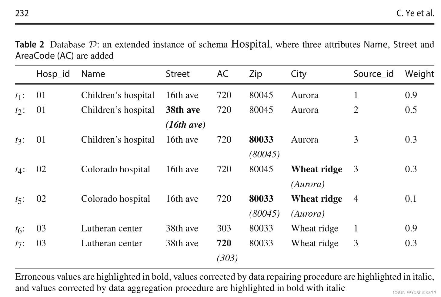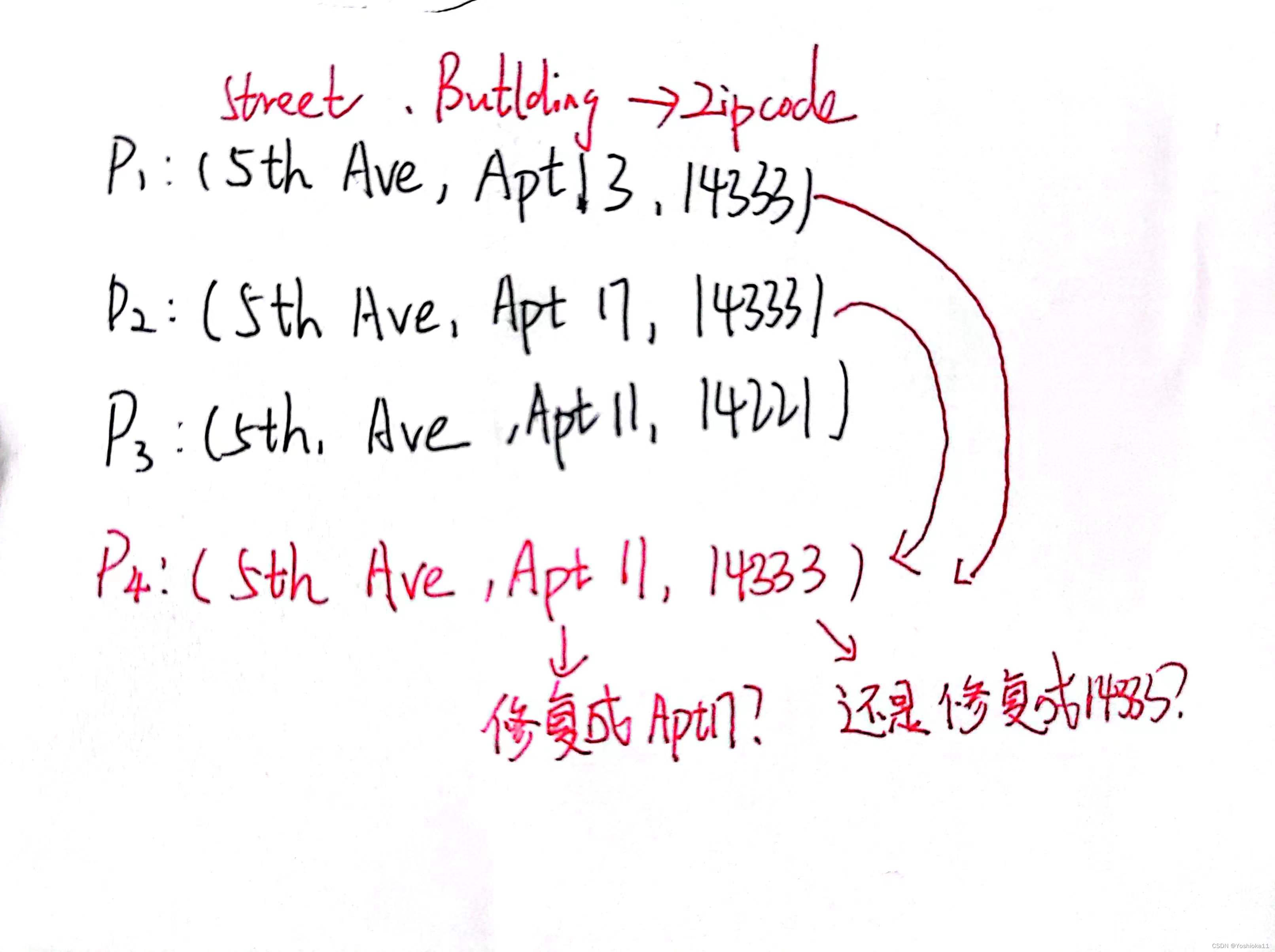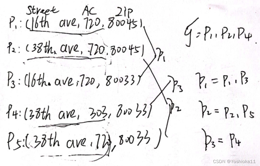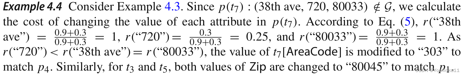 前三个是全局模式,第四个与前三个不符,需要对P4进行修改。然而出现以下问题:若同时考虑对左部和右部都考虑进去,那么是将中间项改成Apt 11以满足P2,还是将14333改为14221以满足P3还是将Apt 11改为Apt 17以满足P2。李建中的方法时:只动右部,不动左部(Therefore,the repair may be unstable.This is the reason why we always choose the repair that modifies the dependent attribute Y)。