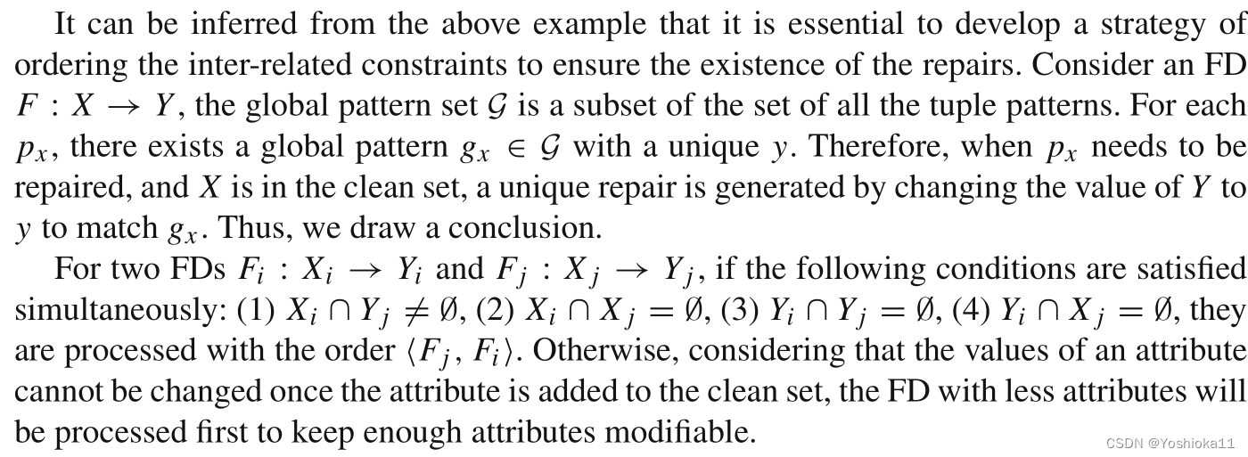 在公共属性上没有重叠,解决一个属性不会影响其他的约束。X→Y,通过XY的结合解决修复错误。但结合可能有多种可能,所以采用“Global Pattern Selection 全局模式选择”。