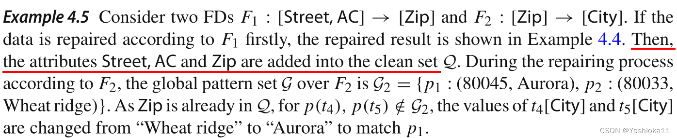 右部都通过某一规则去修复某一元组,可能会导致修复后违反其他的规则。解决措施:按照一定的顺序进行修复。基础思想是为了保持数据的一致性,每一个属性值修改一次。
