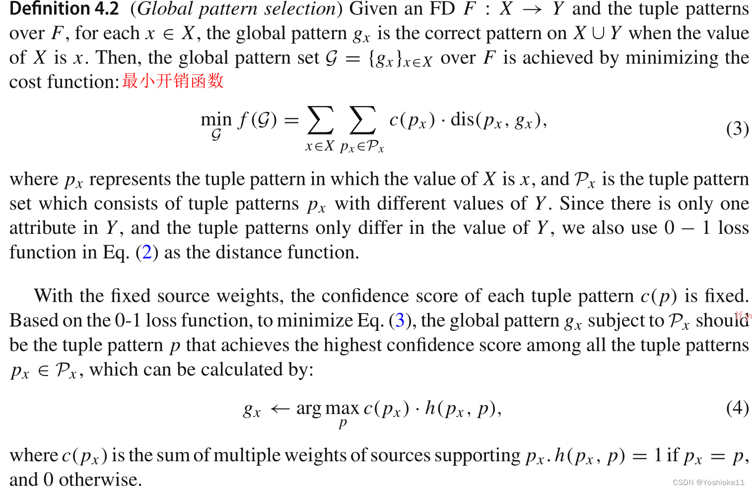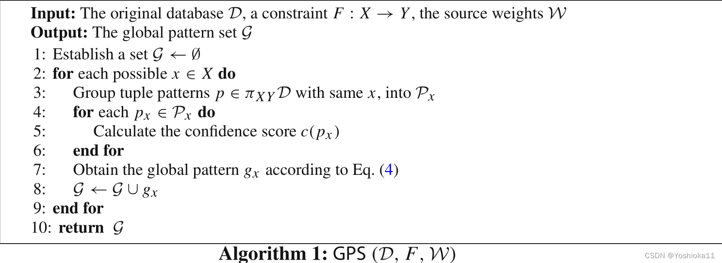 获得全局模式集。1、首先将每条元组左值相同的元组聚集到Px中。px是模式,只表示关键属性的值。2、计算每个模式的可信度c(x),后面看不懂了,原理图片放这先。