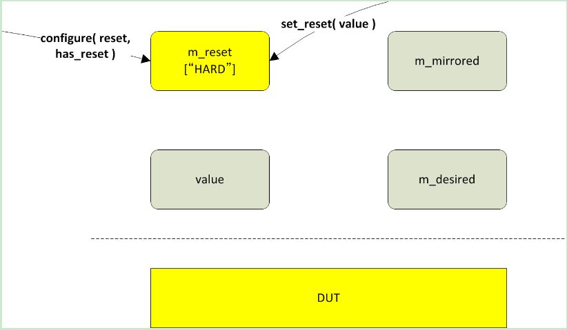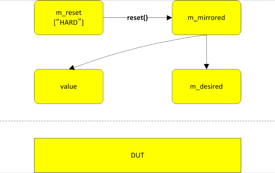 如果存在m_reset[kind], reset()方法将重置寄存器字段的属性。默认的类型是“硬”。如果m_reset[kind]不存在,reset()方法什么也不做。请注意,reset()方法不会重置DUT中的寄存器。它只重置register-field对象的属性。