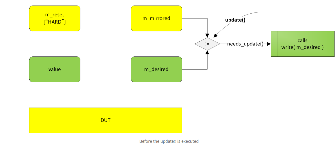update()方法实际上将寄存器值写入DUT。update()方法属于uvm_reg类。uvm_reg_field类没有update()方法。