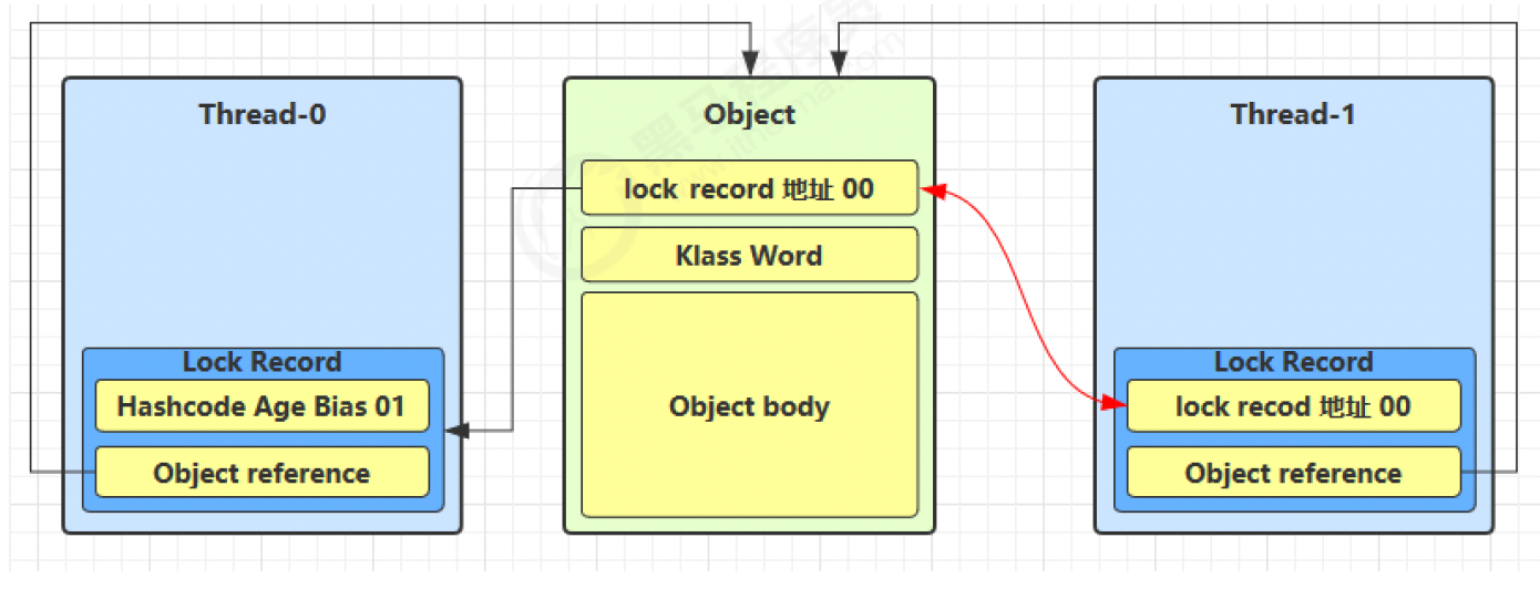 - 让锁记录的对象指针(Object reference)指向锁对象,并尝试用 cas 替换 Object 的 Mark Word ,将Mark Word的值存入锁记录(01 表示无锁状态 [01 还有偏向锁状态] 、00 轻量级锁状态)