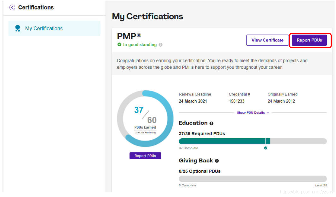 - 查看PDU总体情况,登录状态访问:ccrs.pmi.org