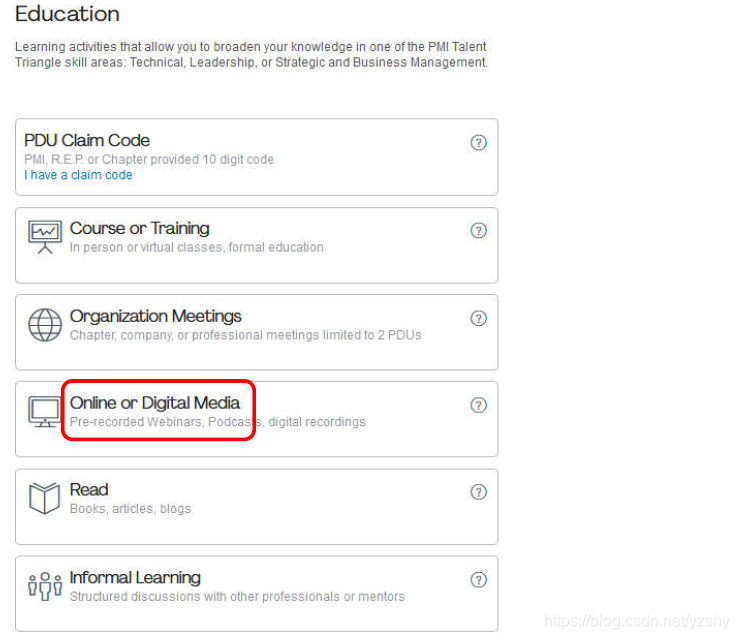 - 点击“Oline or Digital Media”,直达链接:ccrs.pmi.org/claim/new/Event