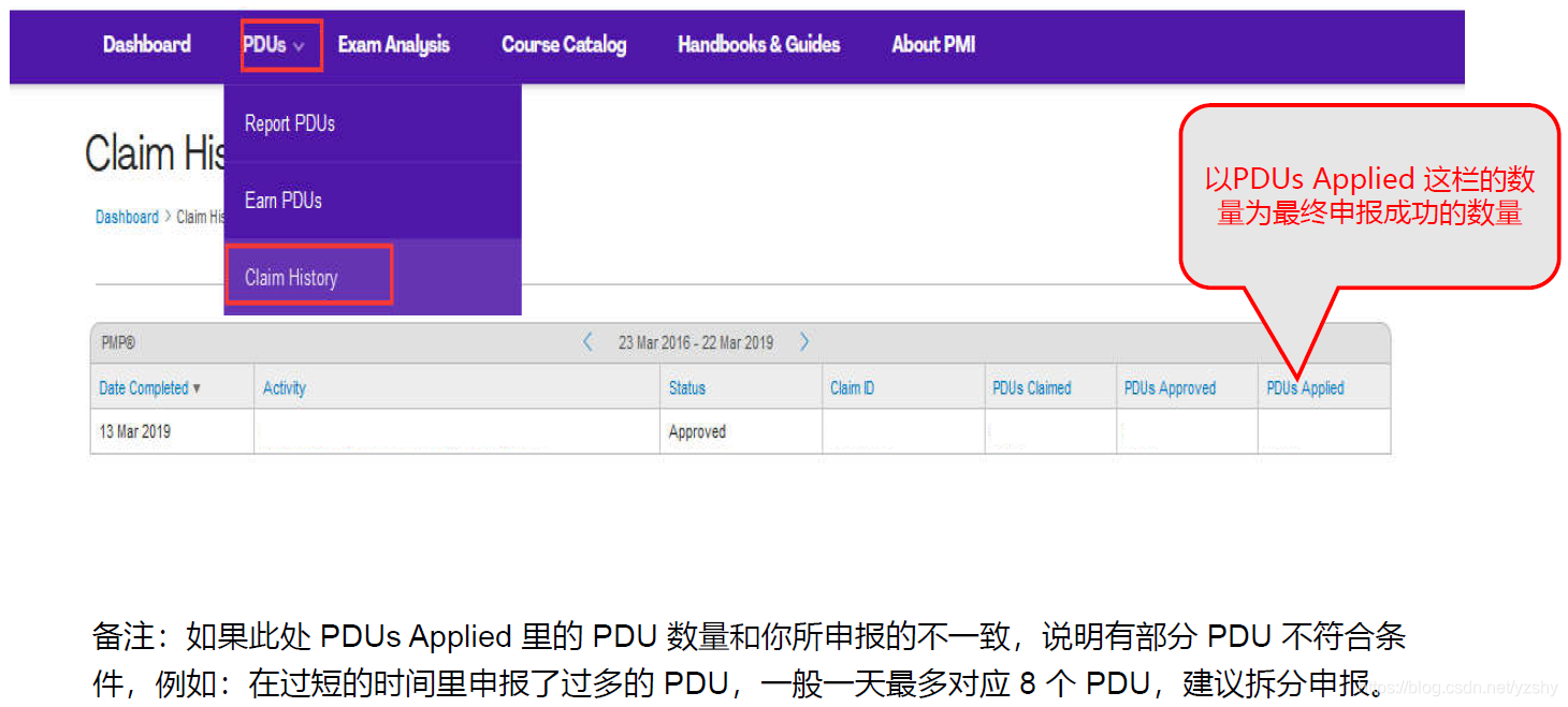 - 查看PDU申报历史情况,登录状态访问:ccrs.pmi.org/claim/history