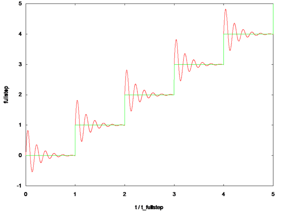使用这种高微步分辨率的结果是电机转子现在以更小的角度或更短的距离步进。当切换到新位置时,如上图所示的过冲和下冲会大大减少。而下图显示了这种差异。