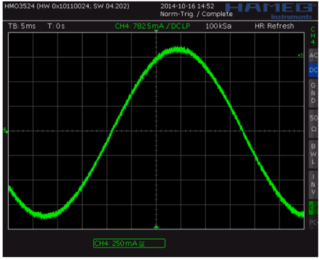 下面两张图比较了电压控制的 StealthChop 和电流控制的 SpreadCycle。StealthChop 的过零行为是完美的:当电流值的符号从正变为负或反之亦然时,没有平台,而是零电流水平的直线交叉,因为电流是基于调制的 PWM 占空比。在 50% PWM 占空比下,电流实际上为零。