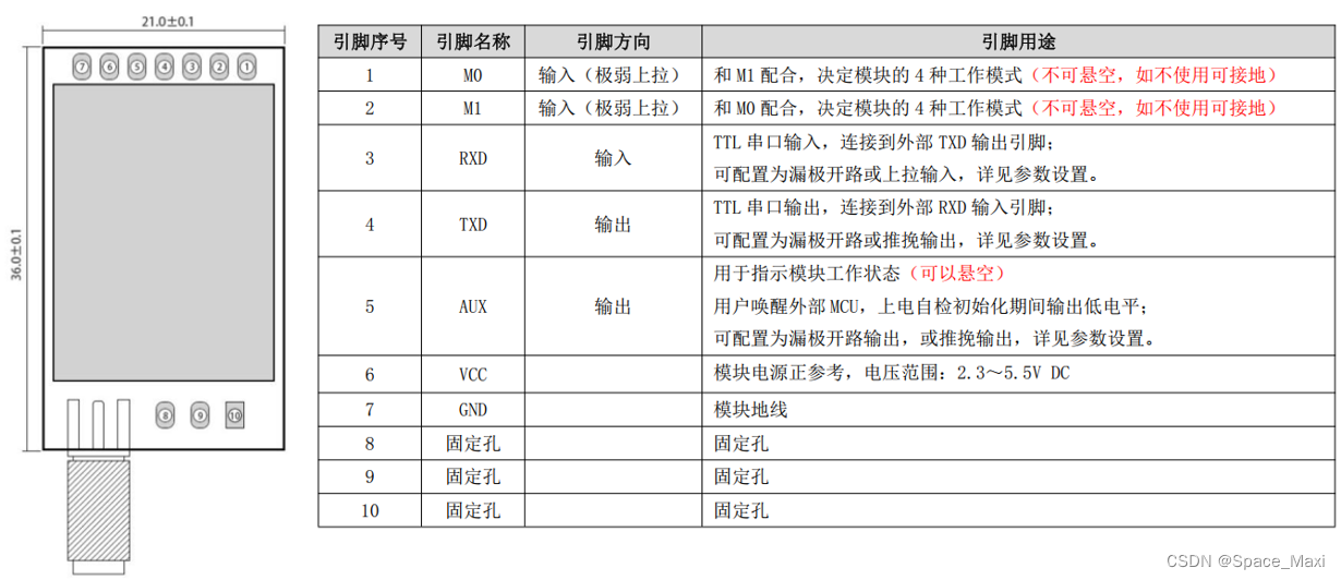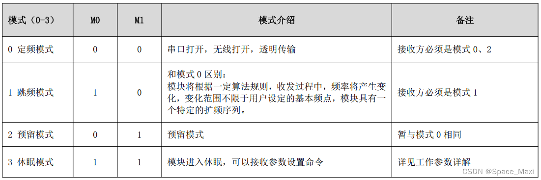 一、该模块有四种工作方式,通过M0和M1引脚进行配置: