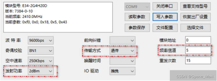 可以修改:发射功率、频率信道、传输方式等。这里只是测试单载波方式,我选择“透传模式”。