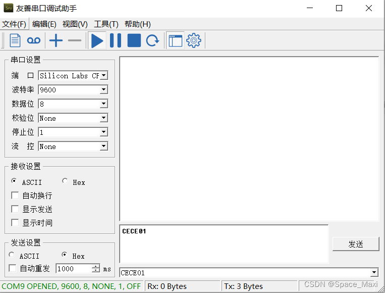 3、通过串口工具,写入单载波发送指令“CECE01”,则芯片进入到“单载波发送模式”。