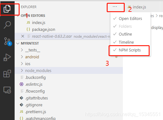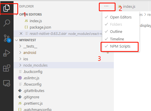 直接点右边的小三角形就可以执行相关的命令,如果没有npm scripts这栏,如下方式打开